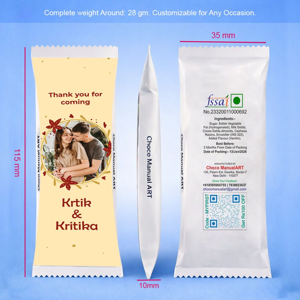 The front of the chocolate wrapper can be customized with your photo, names, and special occasion text, making it a unique and heartfelt gift for loved ones. The elegant design adds a luxury feel, perfect for celebrations and return gifts.