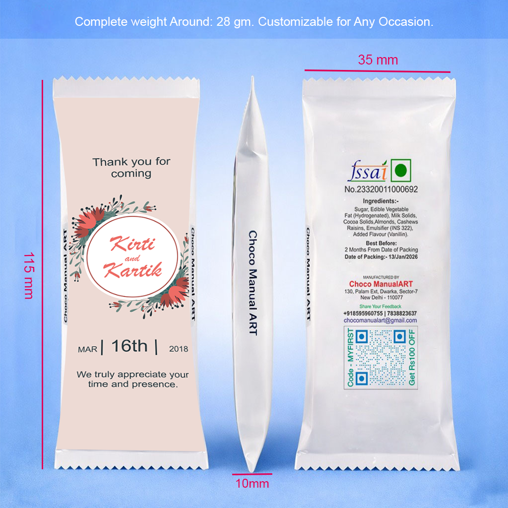 The front of the chocolate wrapper can be customized with your photo, names, and special occasion text, making it a unique and heartfelt gift for loved ones. The elegant design adds a luxury feel, perfect for celebrations and return gifts.