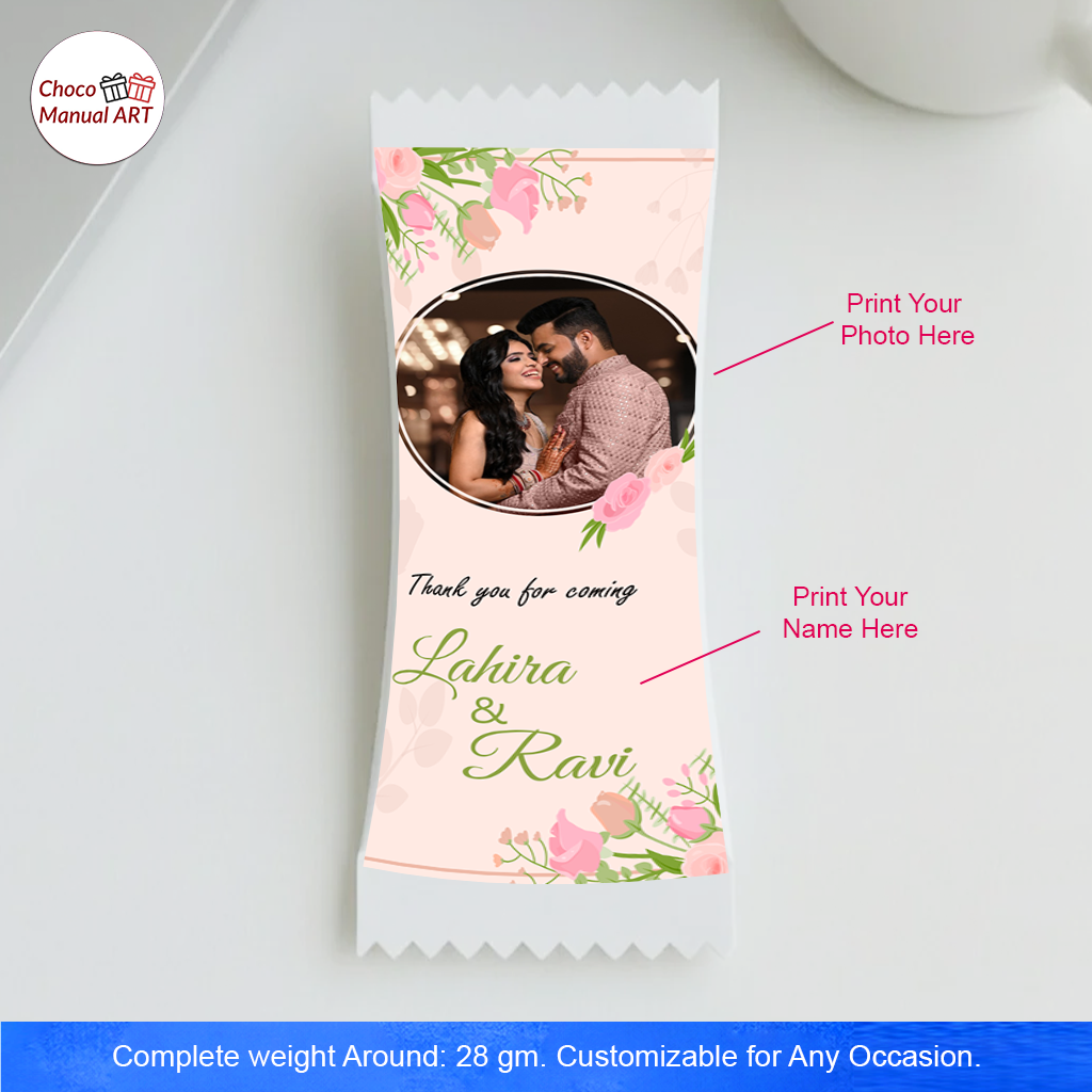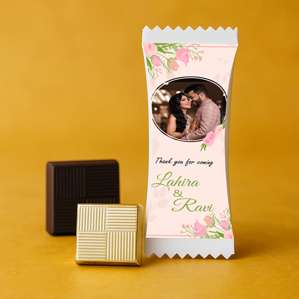 The front of the chocolate wrapper can be customized with your photo, names, and special occasion text, making it a unique and heartfelt gift for loved ones. The elegant design adds a luxury feel, perfect for celebrations and return gifts.