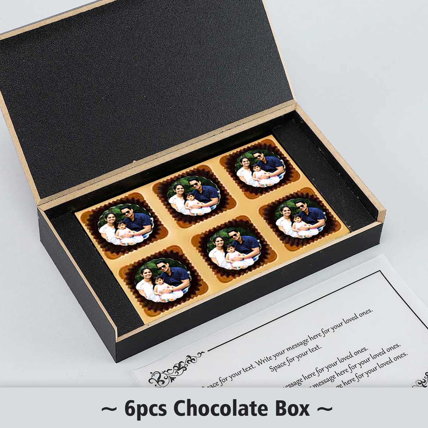 You will get a customized black wooden box with Circle shape all-printed chocolates. There is also a personalized message printed on Message paper inside the box.