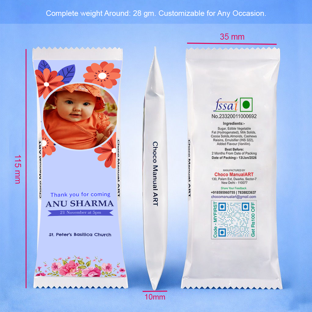 The front of the chocolate wrapper can be customized with your photo, names, and special occasion text, making it a unique and heartfelt gift for loved ones. The elegant design adds a luxury feel, perfect for celebrations and return gifts.