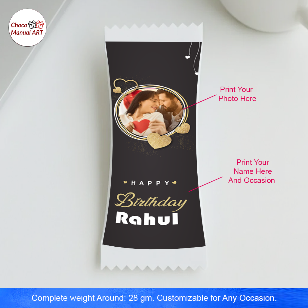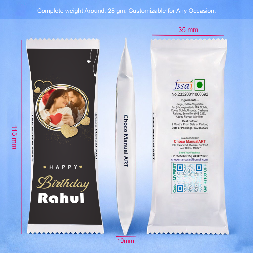 The front of the chocolate wrapper can be customized with your photo, names, and special occasion text, making it a unique and heartfelt gift for loved ones. The elegant design adds a luxury feel, perfect for celebrations and return gifts.