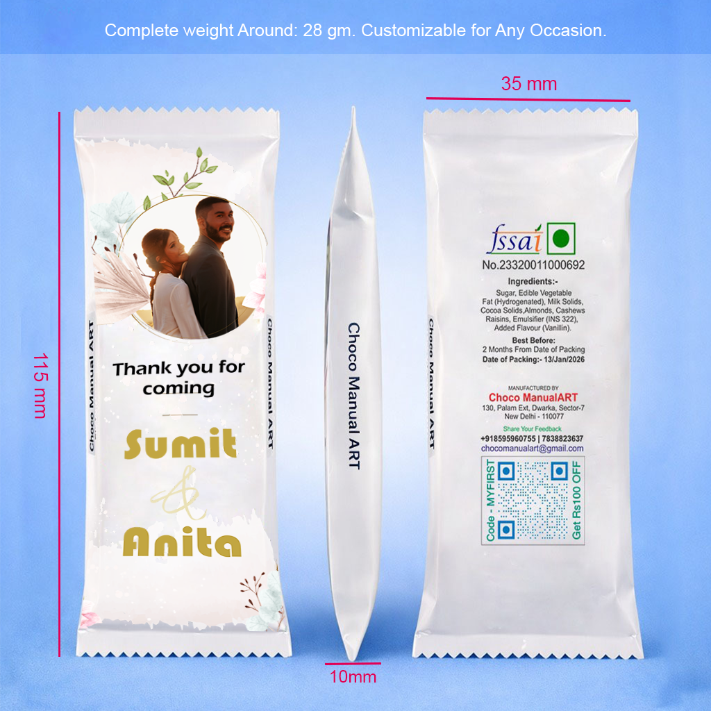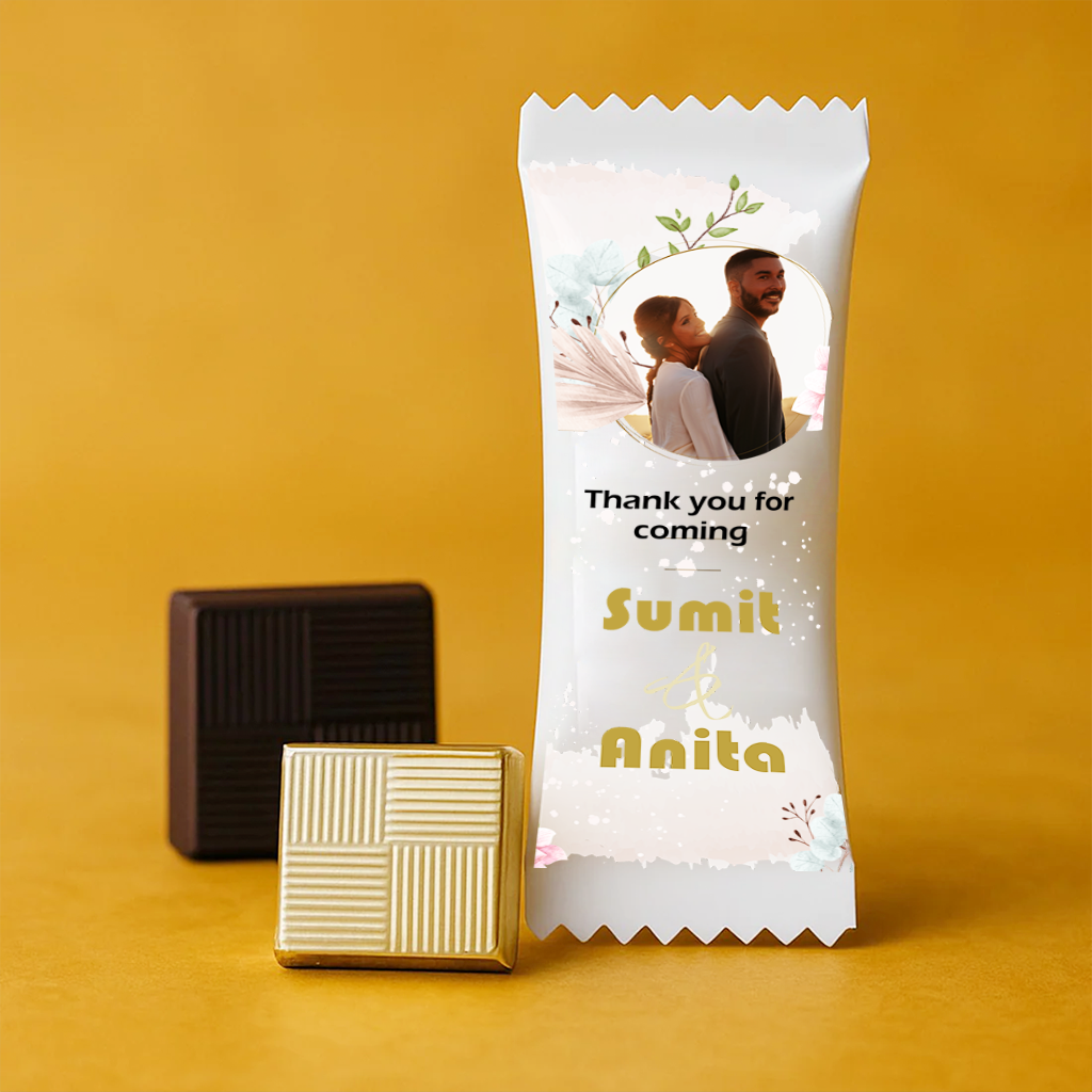 The front of the chocolate wrapper can be customized with your photo, names, and special occasion text, making it a unique and heartfelt gift for loved ones. The elegant design adds a luxury feel, perfect for celebrations and return gifts.
