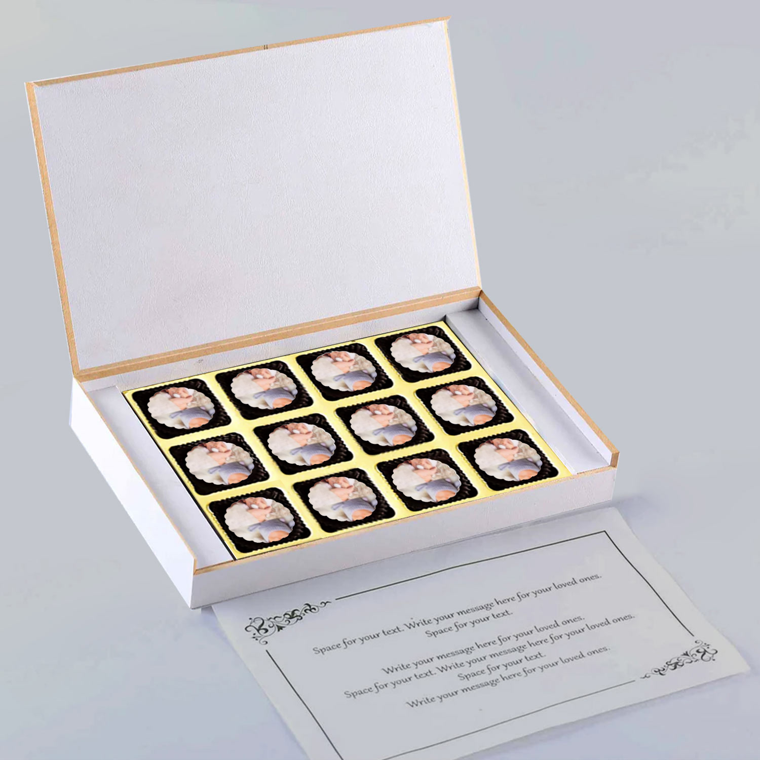 - For printed/photo chocolate:The Printing will be done on the chocolate with edible ink which is safe for consumption.No fillings will be there on printed chocolates.