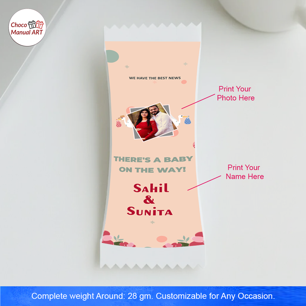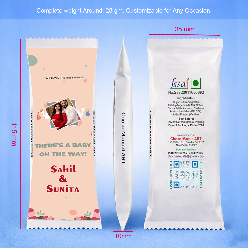The front of the chocolate wrapper can be customized with your photo, names, and special occasion text, making it a unique and heartfelt gift for loved ones. The elegant design adds a luxury feel, perfect for celebrations and return gifts.