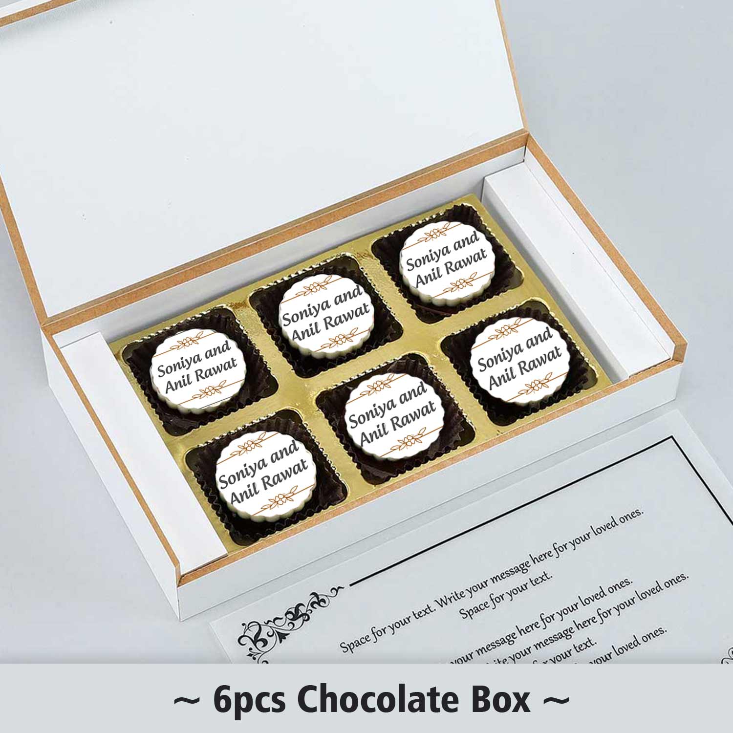 You will get a customized white wooden box with Circle shape all-printed chocolates. There is also a personalized message printed on Message paper inside the box.