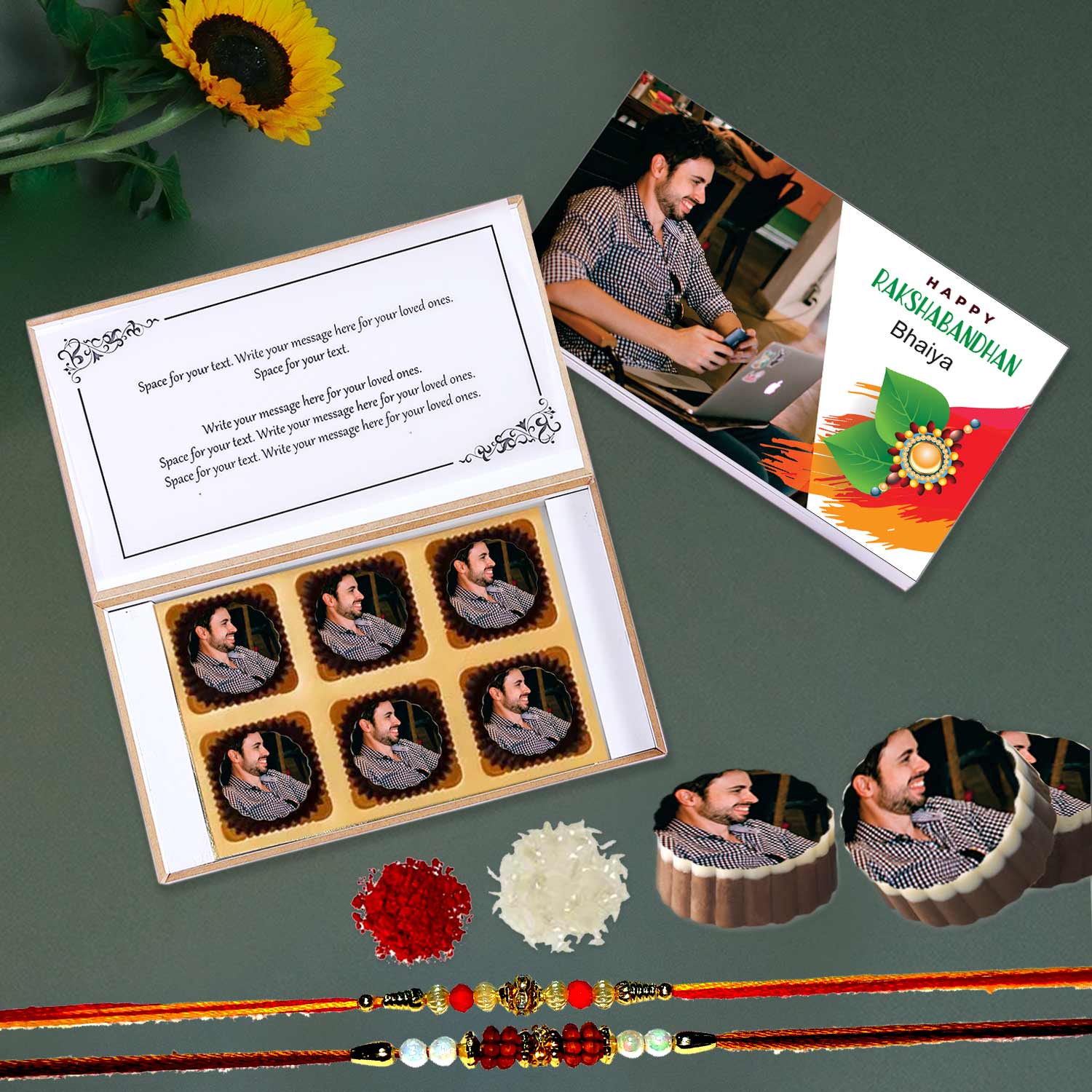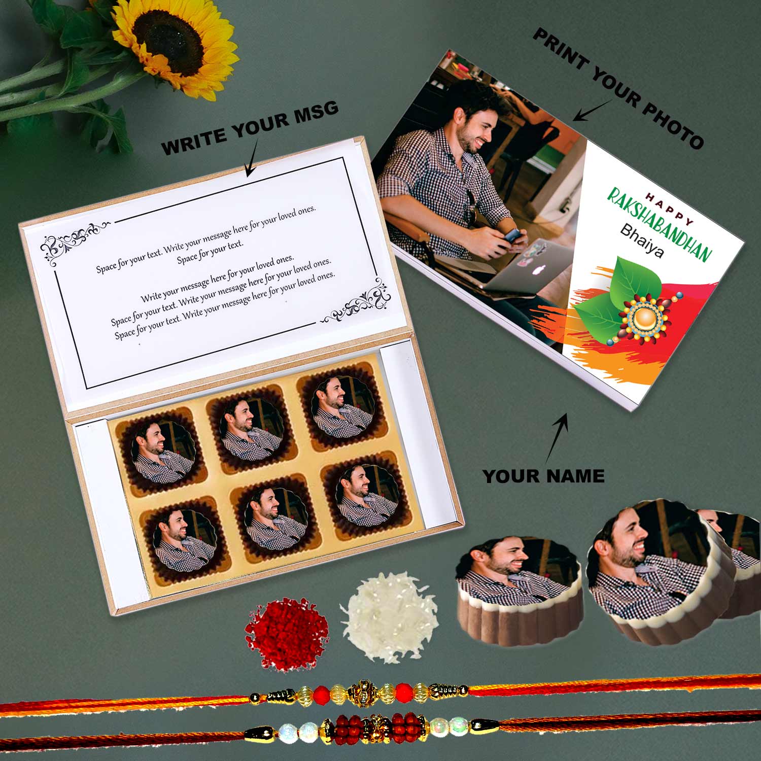 - Please share the name and image that should be printed on the box and or chocolates. This refer to details to whom you are gifting the gift.