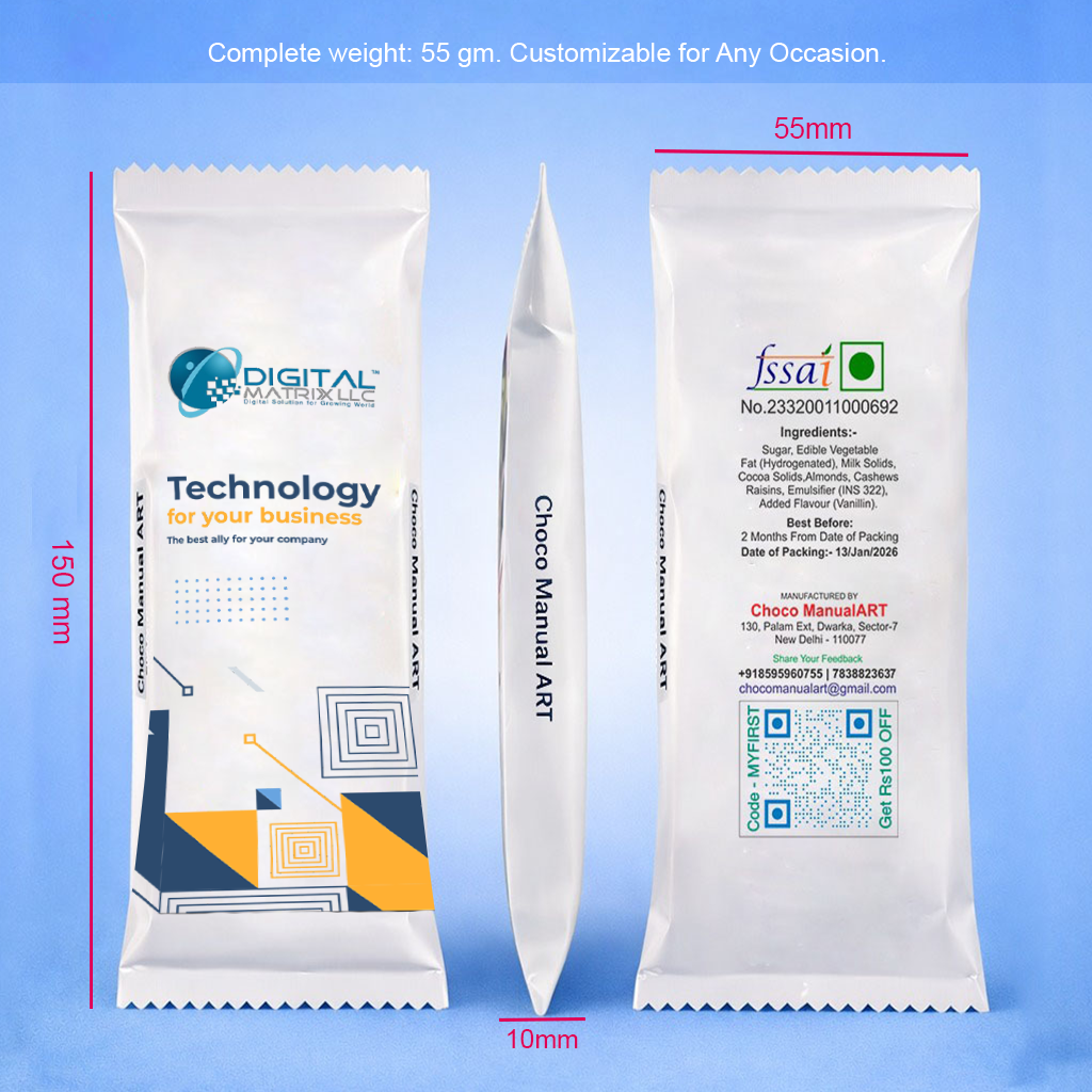 With a total weight of 55 grams, this chocolate bar is ideal for premium single-serve gifting. The compact dimensions (150 mm x 55 mm x 10 mm) make it easy to carry, distribute, and present beautifully.