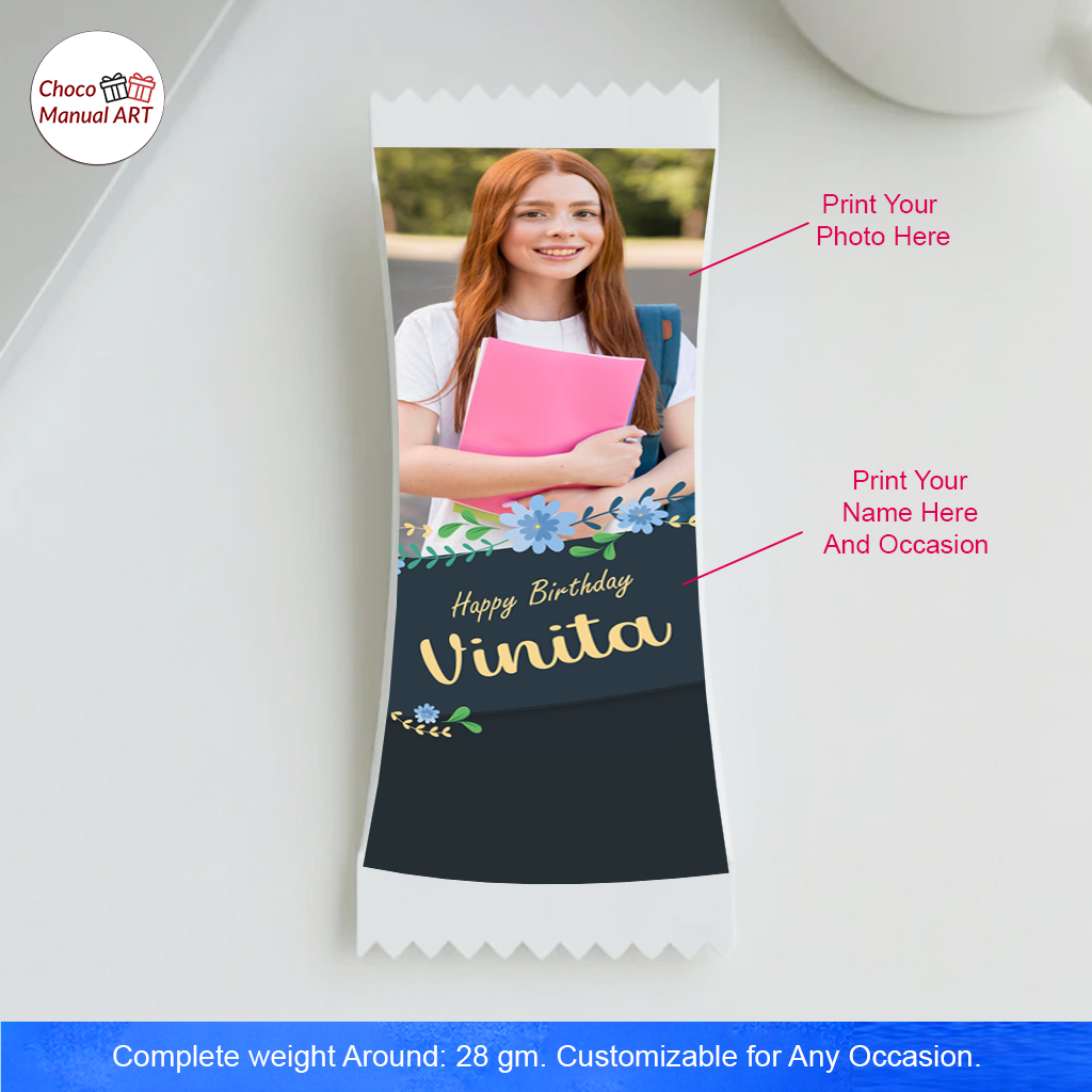 The front of the chocolate wrapper can be customized with your photo, names, and special occasion text, making it a unique and heartfelt gift for loved ones. The elegant design adds a luxury feel, perfect for celebrations and return gifts.
