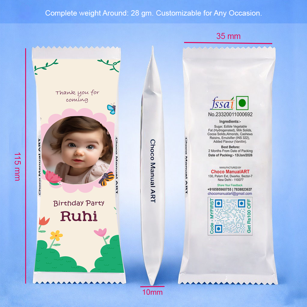 The front of the chocolate wrapper can be customized with your photo, names, and special occasion text, making it a unique and heartfelt gift for loved ones. The elegant design adds a luxury feel, perfect for celebrations and return gifts.